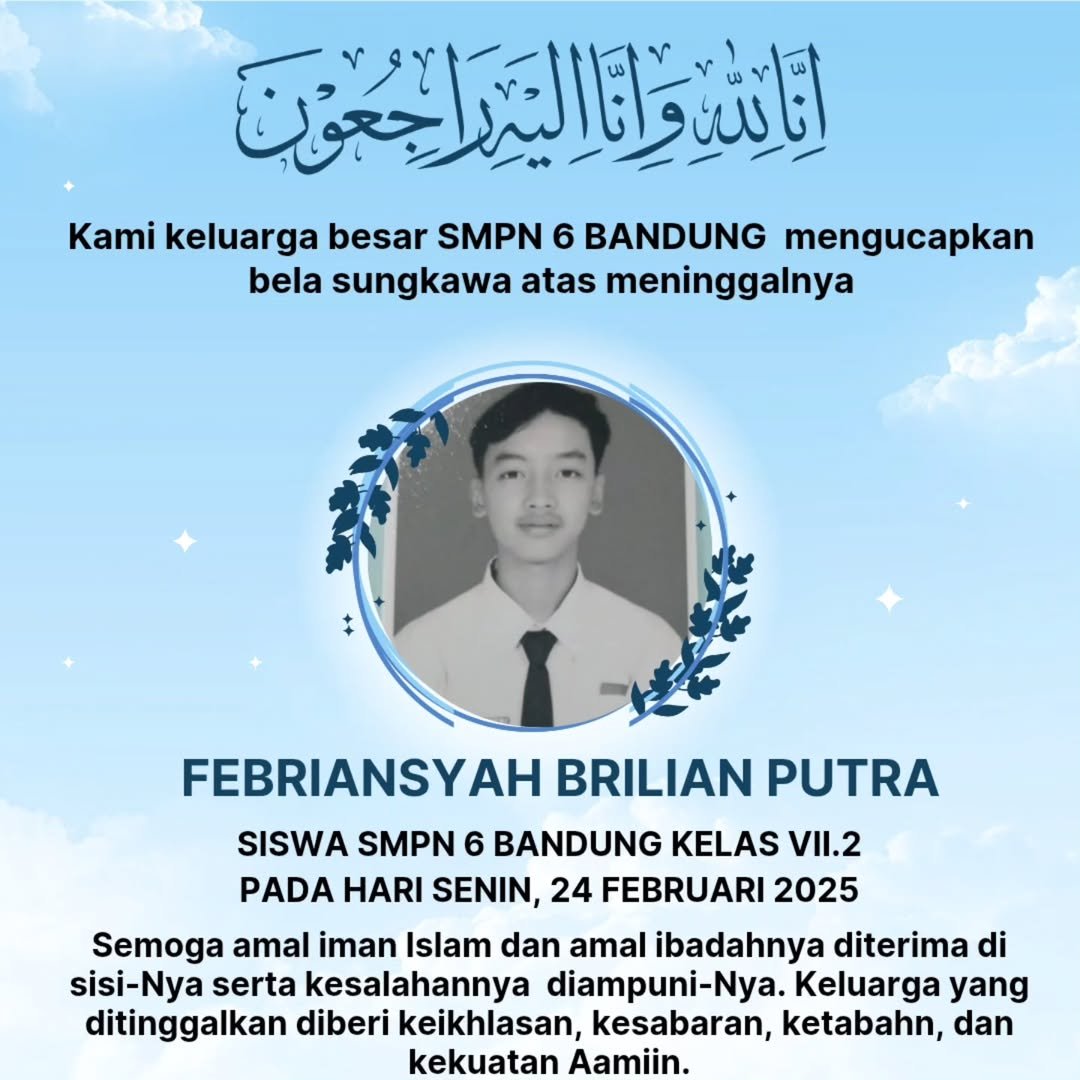 Innalilahi Wa Inna ilaihi Rojiun, Kami Keluarga Besar SMPN 6 Bandung, mengucapkan bela sungkawa atas meninggalnya Febriansyah Brilian Putra Siswa